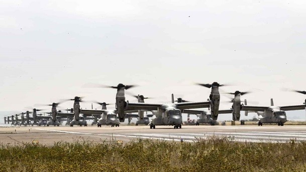 26 конвертопланів Bell V-22 Osprey вчинили одночасний зліт та строєм пройшли над місцем навчань разом із важкими десантними вертольотами морської піхоти Super Stallion.