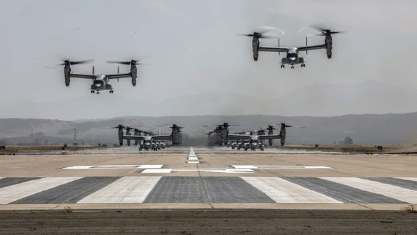 Під час навчань Корпусу морської піхоти США на базі Marine Corps Air Station Miramar в Каліфорнії конвертоплани морських піхотинців Bell V-22B Osprey здійснили масовий політ, відео якого виклали на Youtube-каналі Ultimate Military Channel.