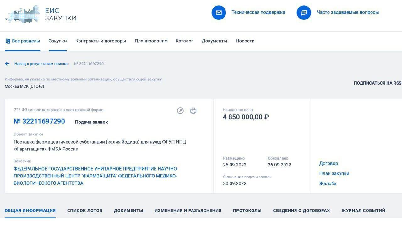 Російське державне підприємство «Фармзахист» на фоні ядерного шантажу РФ оголосило тендер на закупку калію йодиду на суму 5 млн рублів. Підприємство належить до Федерального медико-біологічного агентства.