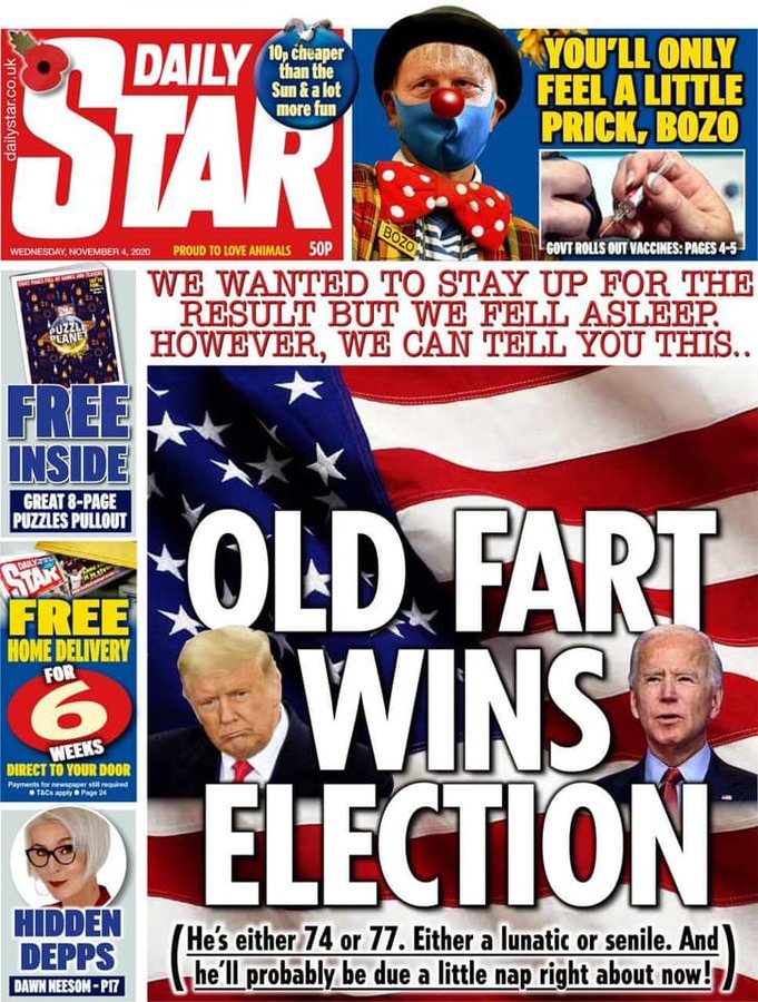 "Ми хотіли дочекатися результатів, але заснули. Втім, можемо сказати одне: Вибори виграв старий пердун. Йому 74 або 77 років. Він або маразматик, або божевільний. І, ймовірно, прямо зараз він теж задрімав" - з твіттера Юрія Марченка.