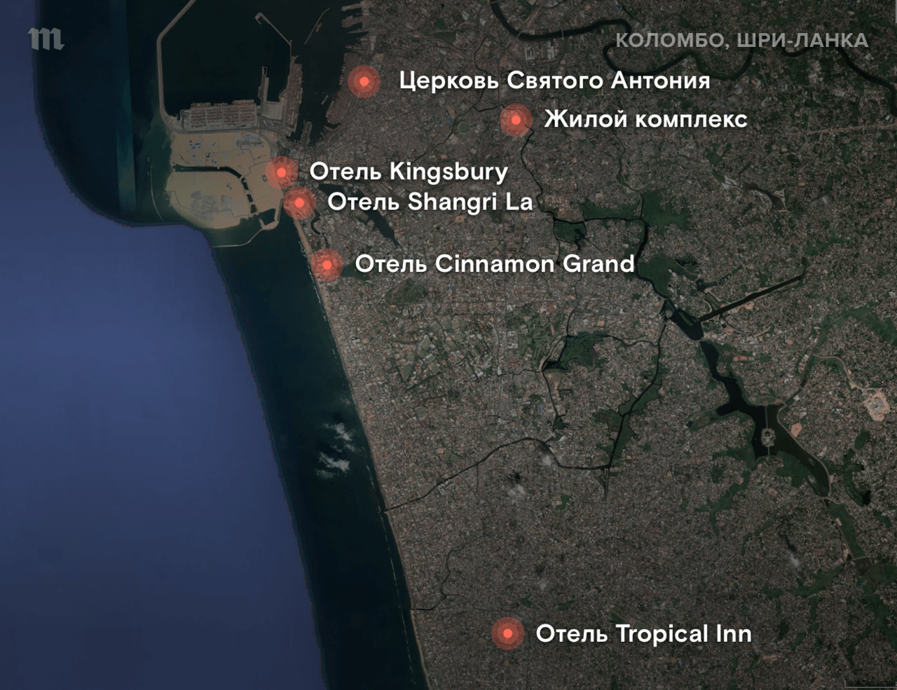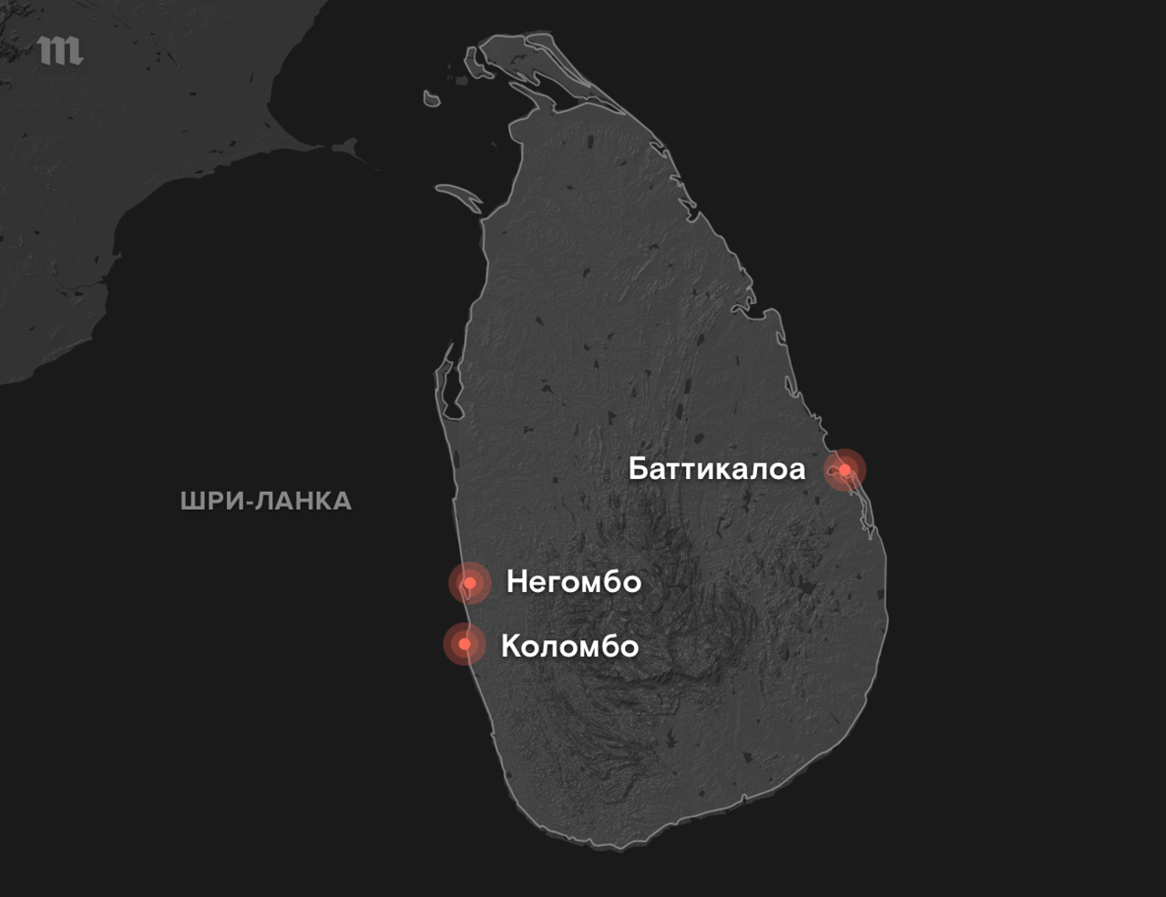 Спочатку вибухи прогриміли в трьох храмах під час великодньої служби, а також в трьох готелях: церква Коччікаде; церква Катувапітье; готель Shangri La; Cinnamon Grand; церква в Баттікалоа; готель Kingsbury. Вже на етапі попередніх підрахунків постраждалих повідомлялося, що загинуло більше 100 людей.