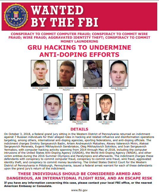 Дмитро Бадін, Артем Малишев, Олексій Мінін, Олексій Моренець, Євген Серебряков, Олег Сотников і Іван Єрмаков звинувачуються в комп'ютерних взломомах, які здійснювалися з 2014 по травень 2018 року, включаючи кібератаки на Антидопінгове агентство Сполучених Штатів (USADA), Всесвітнє антидопінгове агентство (ВАДА) та інші організації, що постраждали під час літніх Олімпійських ігор 2016 року і Параолімпійських ігор.