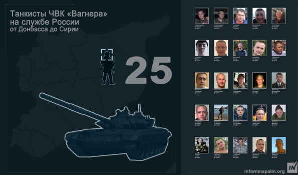 Частина з них брала участь у боях в сирійській провінції Дейр-ез-Зор 7 лютого. Крім того, деякі найманці мають відомчі нагороди за бойові дії на сході України, зокрема, за танкові бої під Луганським аеропортом, підписані особисто президентом РФ Володимиром Путіним.
