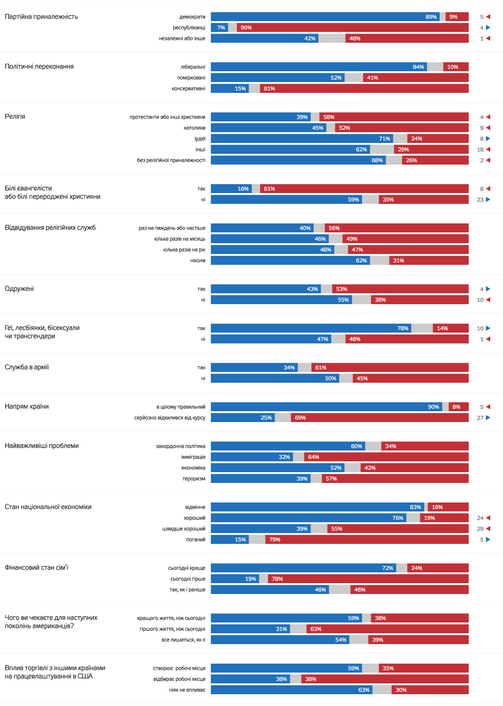 Так само вчинили і 45% білих американців, які закінчили коледж. Також кандидату-демократу віддали перевагу 58% тих, хто закінчив аспірантуру. В цей же час, не залежно від раси, 58% людей, які закінчили аспірантуру, проголосували за Клінтон, в той час як Трампу свій голос віддали лише 37% таких виборців.