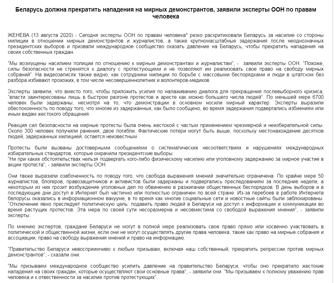 Укладачі документа звернули увагу на те, що білоруські силовики застосовують «надмірну і невибіркову силу» як до учасників мирних протестів, так і до журналістів і медиків.