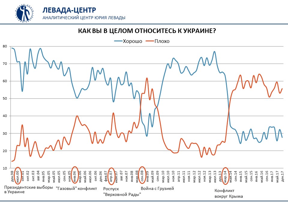 У грудні 2017 року погано або дуже погано ставляться до України 56% жителів Росії, добре і дуже добре – 27%, свідчать дані опитування "Левада-центру".