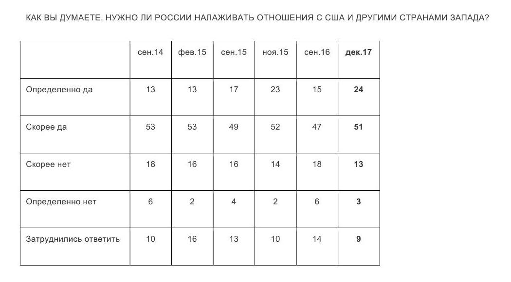 На питання "Чи потрібно Росії налагоджувати стосунки із США та іншими країнами Заходу?" позитивно відповіли 75% жителів Росії.