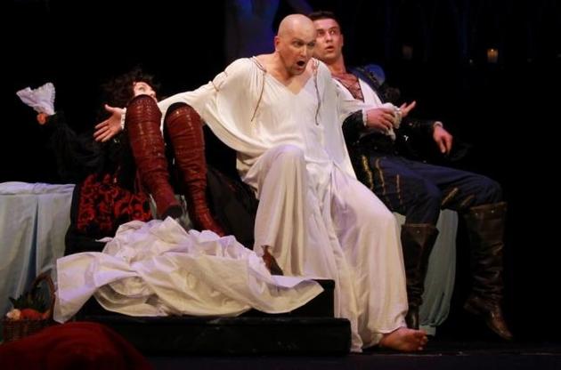 А по центру сцени - величезне пружне ліжко-аеродром, до якого веде слизька гірка. Відчиняється стулка дверей (десь у пітьмі) - і чергова жінка-жертва з радісним "Ех!" плюхається прямо в ліжко сексуального ідола всіх часів і народів. Зрозуміло, у цій виставі є - а) танці, б) дуелі, в) життєрадісний хеппі-енд.