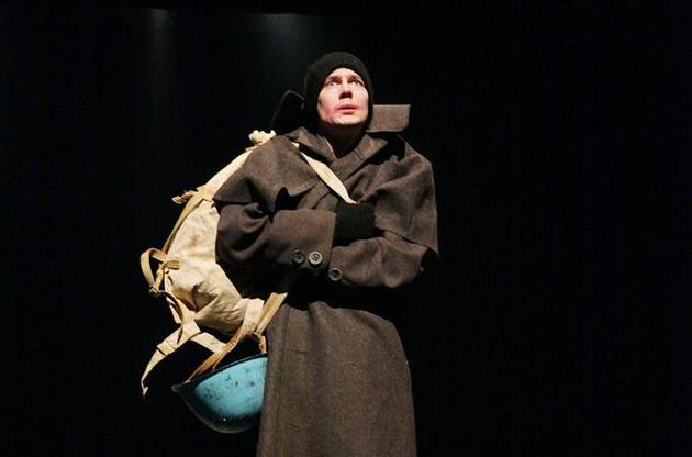 Тепер же місячною доріжкою, що пролягла "над" партером Молодого театру (націлившись не на Місяць, а в черево чорної сценічної коробки), невпевнено навіть не ступає, а наче трохи прикульгує абсолютно новий герой "Лиха з розуму". Це Чацький зразка 2016-го. У потертій шинельці oversize, дешевих кросівках, вовняному кардигані, з наплічником скромного скарбу на худеньких змерзлих плечах. Яскравий знак його нинішньої амуніції - блакитна каска. Каска миротворця, учасника загадкового конфлікту.