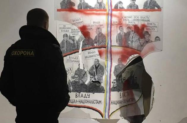 А вже у вівторок, 7 лютого, ближче до вечора, знову-таки, безіменні протестанти, побивши охоронця, ввірвалися в експозиційні зали, пошкодили частину робіт (присвячених Майдану, зокрема). А поверх авторського графіті незграбно, фарбою з балончика, написали: "Слуги сепарів", "Рупор Москви".