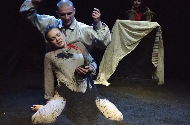 Отже, уявіть, що не такий уже й великий сценічний простір Камерної сцени ніби умисне стиснутий і спеціально звужений до малесенького кавалка чорної землі. У буквальному розумінні. Бо якась крихка сипуча гидота постійно під ногами у героїв Кобилянської. Чорний пісок, мертве міндобриво. Смоляна трясовина, що постійно воліє засмоктати не лише тіло, а й долю.