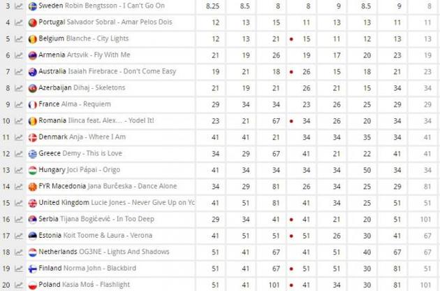 На другому місці може виявитися представник Болгарії Крістіан Костов з піснею Beautiful Mess, а на третьому - шведський співак Робін Бенгтсон з піснею I Can not Go On.