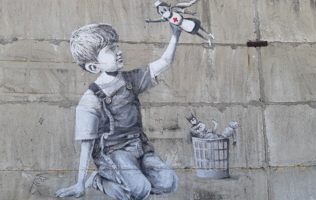 На картині невловимого художника зображений хлопчик, що тримає в руках ляльку-медсестру, а фігурки Бетмена і Супермена відправлені у відро для сміття.
