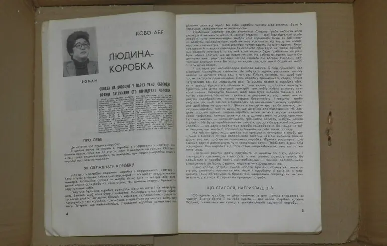 Наостанок трохи про Кобо Абе, чиє життя цілком вписувалося в образ людини-ящика. Плідний письменник вів затворницький спосіб життя, уникаючи контактів із людьми, — однак перейшов до нього не відразу. Замолоду не гребував і політикою, побувавши навіть членом Комуністичної партії Японії, з якої згодом був виключений за її критику. Добряче знався на техніці, ставши першим японським автором, котрий почав набирати тексти на портативному комп’ютері. Одним із перших у країні купив собі синтезатор, який використовував для музичного супроводу театральних постановок власної «Студії Абе Кобо». З музики ж найбільше полюбляв творчість гурту «Пінк Флойд» і композиції Бели Бартока (угорського композитора, який у дитинстві жив у закарпатському місті Виноградово й об’їздив край, збираючи народний фольклор). Захоплювався фотографією (недарма ж і герой «Людини-коробки» не розлучався з фотоапаратом), причому одним із його улюблених об’єктів знімання були сміттєзвалища. Письменник відзначився як винахідник одного з видів колісного ланцюга протиковзання, який відрізнявся від аналогів легкістю натягування, за що отримав патент і срібну медаль на Міжнародній виставці винахідників. А от бажаної Нобелівської премії з літератури Кобо Абе не дочекався, хоч і був кандидатом на неї, і якби не передчасна смерть 1993 року, зрештою мав би її отримати.