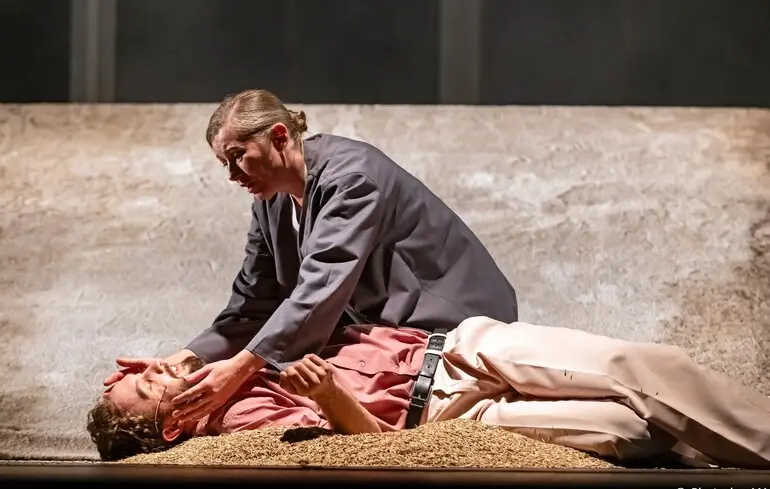 Світ ніколи не буде таким, як раніше, для всіх, хто пройшов випробування війною. Тому до будь-яких «воєнних» тригерів (камуфляж, зброя, гучні звуки тощо) у театральному світі нині треба мати особливий підхід, памʼятаючи головний принцип — «не нашкодь». Сценографічно у виставі умовність простору художниця (вона ж авторка костюмів) Катерина Кардель вирішила зробити максимально віддаленою від війни. На поворотному колі сцени розміщено підвищений настил: з одного боку — з крутим схилом, з іншого — з розділеними між собою східцями. На цьому підвищеному постаменті, що сполучає різні сторони конструкції, стоять поєднані між собою чотири арки, в центрі яких підвішено дзвони. Вони, звісно ж, звучатимуть на цій «материнській Голгофі» якимись окремими звуками відчаю.