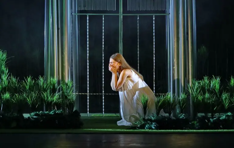 Глибину сцени закрито чорною завісою. І хоча буферну та дуже відносно безпечну зону — територію між сторонами, що воюють, — прийнято називати «сірою зоною», біля зупинки «Вирію» — лише тотальна темрява чорноти. Інших акцентів не буде, допоки не підніметься завіса. І в залі чутно нестримне «ого!». І є чому дивуватися. Перед глядачами у глибині сцени постає майже семиметрова чудернацька споруда, візуально схожа на казкове залізне дерево, по обидва боки якого «насаджено» яскраво-зелену рослинність. Ласкаво прошу до «Вирію».