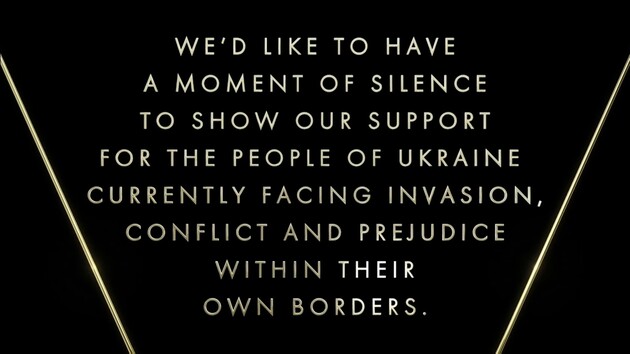 «Ми просимо вас про момент тиші на знак солідарності з народом України, який зараз стикається із вторгненням, конфліктом та несправедливістю на власній землі. Хоча кіно є для нас важливим способом висловити нашу людяність, реальність така, що мільйони сімей в Україні потребують їжі, медичного обслуговування, чистої води та екстреної допомоги. Ресурсів мало, і ми – як глобальна спільнота – можемо зробити більше. Ми просимо вас підтримати Україну як ви тільки можете. Стоїмо з Україною».
