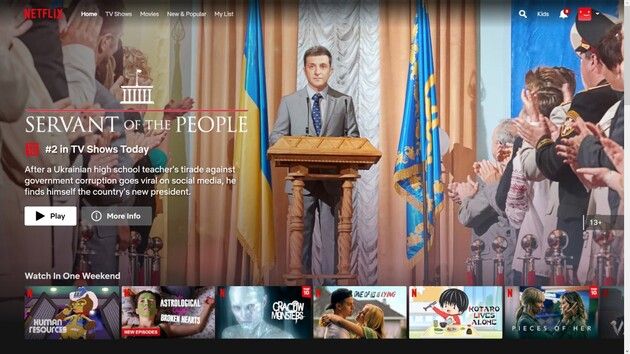 Стрімінговий сервіс Netflix почав транслювати український серіал "Слуга народу" в США. За декілька днів він посів друге місце в рейтингу Netflix.