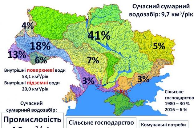 Вплив змін клімату ми оцінюємо через так званий показник дефіциту кліматичного водного балансу, тобто порівнюємо те, що надходить, із тим, що випаровується. Сьогодні сумарне випаровування перевищує те, яке було три десятиліття тому, на 40 - 45 куб. км на рік. Внаслідок цього, незважаючи на зменшення водоспоживання - з 31 куб. км в 1991 році до 9 куб. км у 2019 р., загальні витрати води з території України сьогодні на 20-25 куб. км більші, порівняно з 1991 роком."