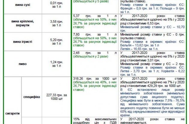 Міністерство фінансів в рамках податкової реформи пропонує підвищення всіх акцизів з 2016 року, а надалі - щорічне збільшення на 5% (для сигарет - на 7%) протягом 2017-2020 років.