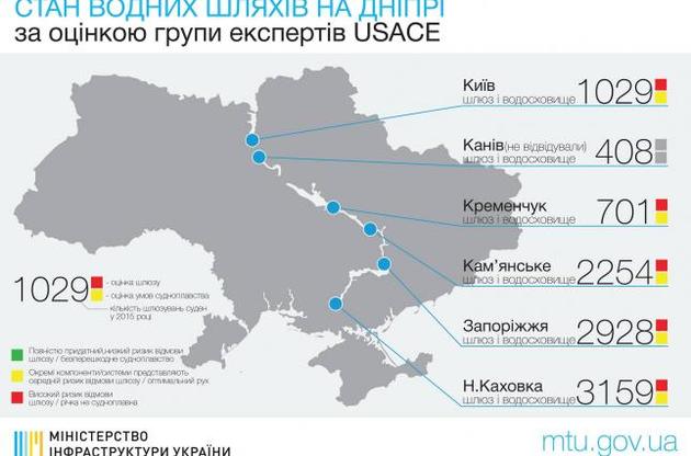 "Американські інженери завершили технічне обстеження 5 шлюзів на Дніпрі, висновки звіту - це незадовільний стан об'єктів і необхідність термінової реконструкції. Для вирішення цього питання міністерством заплановано фінансування з фонду бюджетної підтримки від ЄС у розмірі 105 млн гривень, щоб уникнути екологічної небезпеки", - процитувала Омеляна прес-служба міністерства.