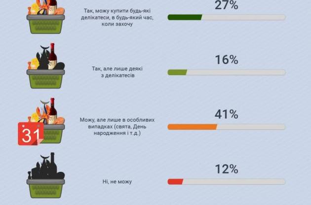 Понад чверть опитаних стверджують, що можуть придбати будь-які делікатеси у будь-який час, коли їм захочеться. Ще 16% відповідають, що можуть купувати делікатесні вироби у будь-який час, але лише деякі з них. І 12% респондентів зізналися, що взагалі не можуть дозволити собі купувати будь-які делікатесні продукти.