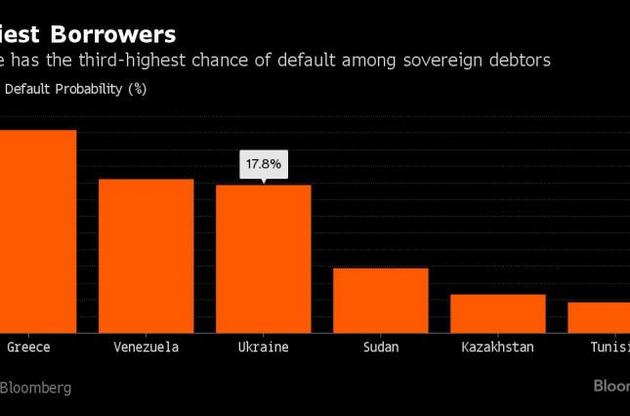 Згідно з рейтингом Bloomberg, ризик дефолту України в найближчі три роки відповідає 17,8% (прогноз враховує такі фактори, як економічне зростання, непогашена заборгованість і політичні ризики). Україна за цим показником знаходиться на третьому місці в світі після Греції та Венесуели.