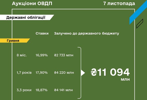 За результатами аукціону, який провели 7 листопада, залучено 11,09 млрд грн.