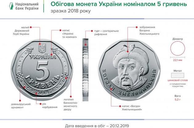 "Нова обігова монета номіналом 5 гривень - невелика за розмірами, легка, срібляста. Завдяки більшому діаметру і викарбувана на монеті багатограннику громадянам буде легко відрізнити її від обігових монет інших номіналів. Її діаметр становить 22,1 мм, вага - 5,2 г. Вона виготовлена з цинкового сплаву з гальванічним покриттям нікелем", - йдеться в повідомленні.