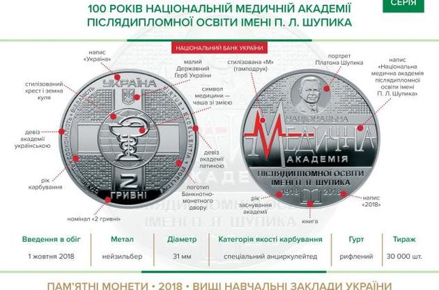 Національний банк України ввів в обіг пам'ятну монету "100 років Національної медичної академії післядипломної освіти імені П. Л. Шупика". Про це повідомляє прес-служба НБУ на сторінці в Facebook.