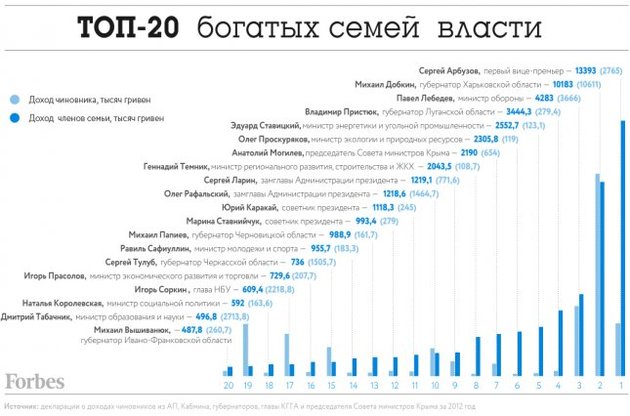 Друге місце у рейтингу, складеному українським журналом Forbes, посідає сім'я харківського губернатора Михайла Добкіна (10,2 млн грн), третє - сім'я міністра оборони Павла Лебедєва, чий дохід склав 4,3 млн грн. Звідки такі суми, декларанти не уточнюють, вказуючи лише, що це "дивіденди і відсотки".