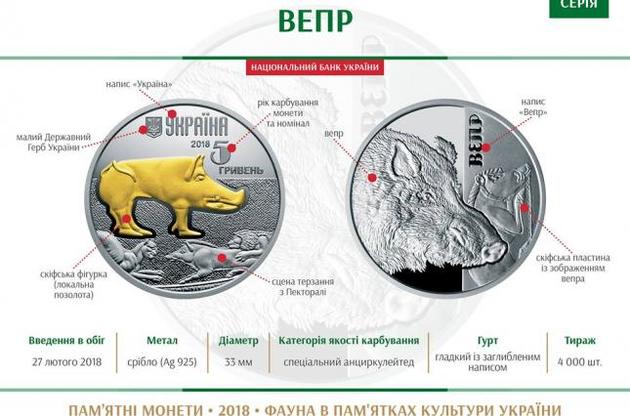Сьогодні, 27 лютого, Національний банк України ввів у обіг пам'ятну монету "Вепр" номіналом 5 гривень, повідомляє прес-служба Нацбанку.