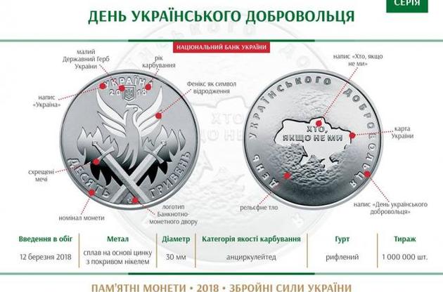 Сьогодні, 12 березня, Національний банк ввів в обіг пам'ятну монету "День українського добровольця", яка має номінал 10 грн, говориться у повідомленні на сторінці НБУ в Facebook.