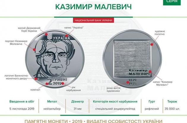 На аверсі монети угорі на дзеркальному тлі розташовано малий державний герб і напис "Україна" праворуч від нього, на матовому тлі у центрі - портрет Казимира Малевича, внизу - напис "2 гривні 2019". На реверсі зображено художнє полотно, підготовлене до роботи, на тлі якого розміщено напис "Казимир Малевич", унизу - роки життя художника: "1979-1935".