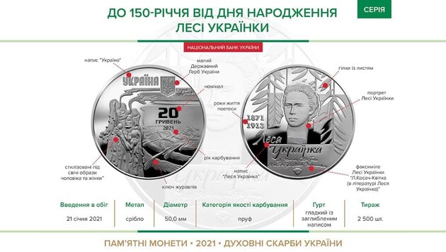 Нацбанк з четверга, 21 січня 2021 року вводить в обіг пам'ятну монету "До 150-річчя від дня народження Лесі Українки". Про це повідомляє прес-служба НБУ.