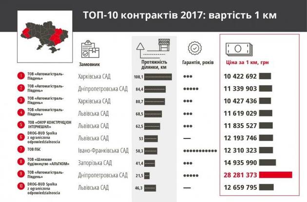 У зв'язку з цим середня вартість ремонту 1 км дороги у відповідності з іншими дев'ятьма контрактами становить понад 11,24 млн грн, що майже дорівнює вартості капітальних ремонтів територіальних доріг державного значення, які також увійшли до ТОП-10 контрактів і виконуються польською компанією DROG-BUD Spolka z ograniczona odpowiedzialnoscia.