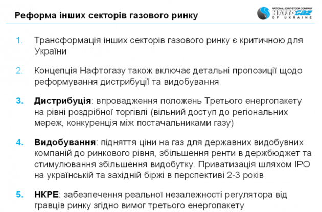 Згідно з озвученими напередодні головою НАК Андрієм Коболєвим планами, реформа сектору видобутку передбачає підвищення ціни на газ для державних видобувних компаній до ринкового рівня, збільшення ренти в держбюджет та стимулювання збільшення видобутку.