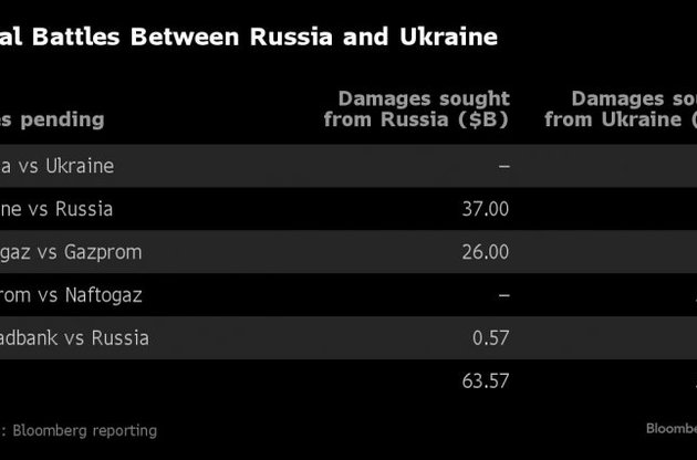 За підрахунками видання, на сьогодні Україна вимагає від РФ понад $ 63,5 млрд, тоді як Росія - $ 35 млрд. Зазначимо, що видання не враховувало ще низку позовів, які Україна збирається подати в міжнародні суди проти Росії, про що раніше писало DT.UA.