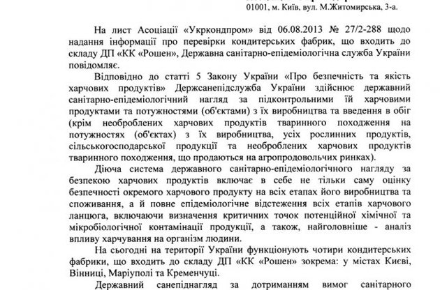 Державна санітарно-епідеміологічна служба України у відповідь на лист асоціації "Укрокондпром" від 06.08.2013 щодо продукції Roshen повідомила: