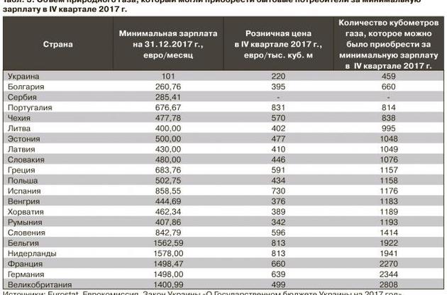 "Отже, в Україні до 2017 р. мінімальна зарплата, як це передбачено Законом України "Про Державний бюджет України на 2017 рік", становила 3200 грн в місяць. Курс НБУ за четвертий квартал 2017 р. - 31,77 євро/грн. Тобто мінімальна зарплата в Україні в жовтні-грудні 2017-го була еквівалентна 101 євро. Аналогічні розрахунки для першого кварталу 2018 р. дають значення мінімальної зарплати у 111 євро. Тобто різниця в зарплаті між кварталами офіційно незначна, - йдеться в статті. - Таким чином, кількість газу, яку можна було придбати в Україні за мінімальну зарплату (459 кубометрів), не дотягує навіть до нижньої планки середнього діапазону споживання газу населенням у ЄС (525-5250 кубометрів у рік)".
