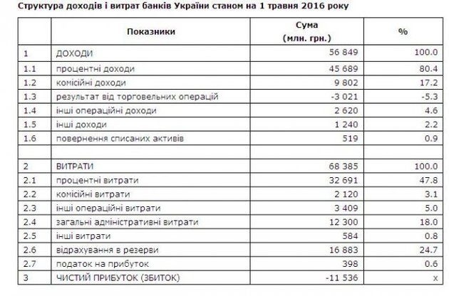 Так, доходи працюючих банків України за станом на 1 травня 2016 року порівняно з відповідним періодом 2015-го скоротилися на 20,2% і становили 56,8 млрд грн. Витрати скоротилися на 19,6% і склали 68,4 млрд грн.