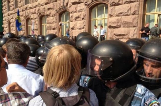 Представники опозиційних партій прийшли на акцію біля будівлі 3, де 11 липня відкрилося пленарне засідання, яке в опозиції вважають нелегітимним. Вхід до Київради взяли під охорону співробітники "Беркута".