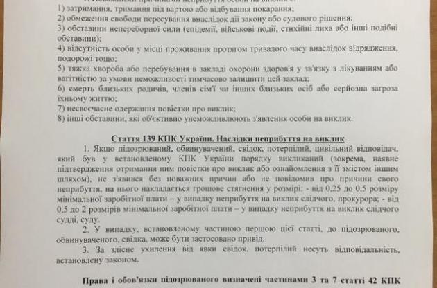 Зазначається, що Янукович у відповідності з вимогами ст.ст.133, 135 КПК України повинен з'явитися 17 жовтня о 11:30 в кабінеті управління з розслідування злочинів, вчинених злочинними організаціями для участі у проведенні слідчих і процесуальних дій у кримінальному провадженні № 42014000000000416 від 21 травня 2014 року. Екс-главу України викликають на допит у якості підозрюваного.