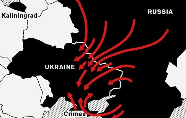 Міністерство оборони Великої Британії опублікувало черговий план вторгнення Росії в Україну. Британське силове відомство опублікувало на своїй сторінці в Twitter змодельоване відео, де демонструються клини ударних напрямків російських окупаційних сил, що атакують Україну.