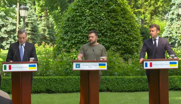 Мир має бути встановлений на умовах України, включно з поверненням Криму. Таку позицію підтримали прем'єр-міністр Італії Маріо Драгі та президент Франції Еммануель Макрон на пресконференції у Києві після зустрічі лідерів України, Франції, Німеччини, Італії та Румунії.