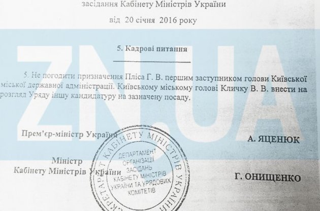 В цей же день Кабмін на своєму засіданні відмовився погодити кандидатуру Геннадія Пліса, якого називають людиною Вадима Столара, на посаду першого заступника голови КМДА і Кличко запропонував внести іншу кандидатуру на цю посаду. Про це йдеться у витязі з протоколу засідання уряду, яке є в розпорядженні DT.UA.