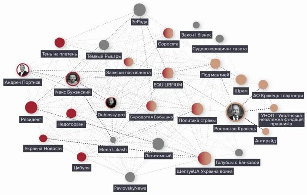 Ще один умовно відомий канал у цій мережі – «Андрей Портнов», який за президентства Януковича «курував судами». Портнова часто репостить канал депутата Максима Бужанського, який блокує прийняття закону щодо заборони діяльності організацій, які під виглядом релігійної діяльності шкодять нацбезпеці. А також в коло цих Telegram-каналів належить Dubinskyi.pro Олександра Дубінського, якого підозрюють у державній зраді. Також є пряма взаємодія цих каналів із «Шептун UA», «Политика страны», Equilibrium=, «Бородатая бабушка», «Записки пасквилянта», «Соросята».