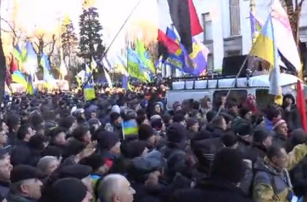 Будівлю парламенту, куди прибула колона учасників Євромайдану, оточено щільним кільцем співробітників правоохоронних органів.