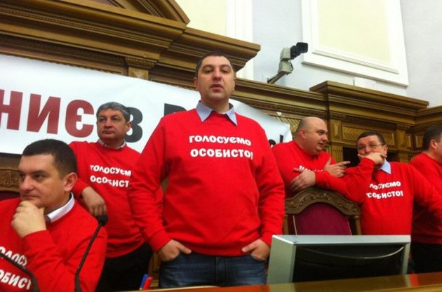 Зазначимо, що частина опозиційних депутатів прийшла в парламент у червоних светрах з написом "Голосуємо особисто!".