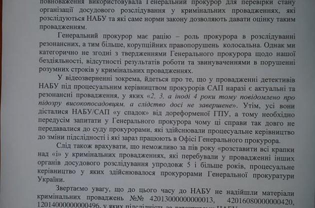 "Категорично не згодні з твердженням генерального прокурора щодо нашої бездіяльності, відсутності результатів роботи і звинуваченнями в порушенні розумних строків у кримінальних провадженнях", - йдеться у листі, опублікованому ввечері 26 травня на сторінці САП у Facebook.